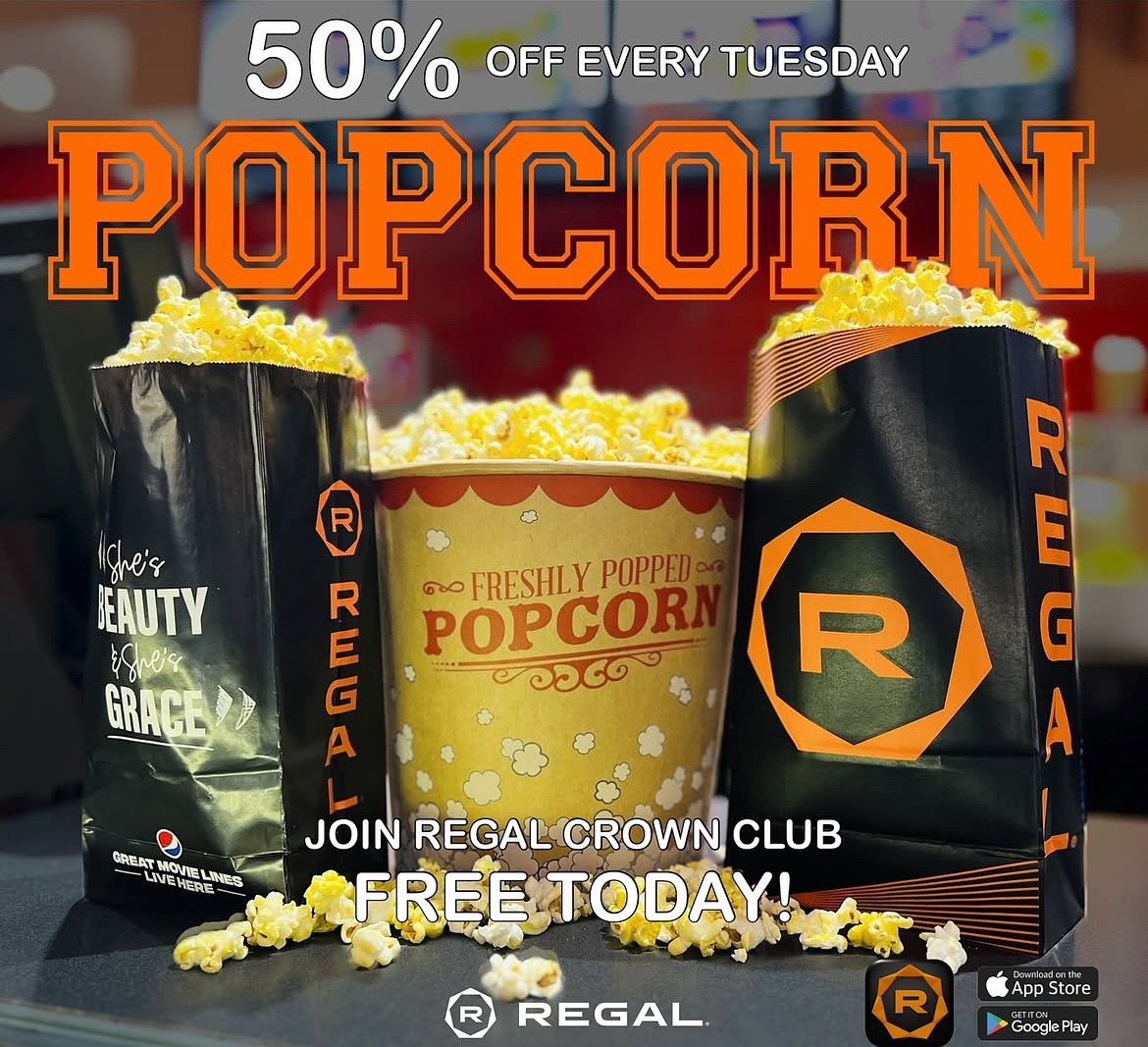 Enjoy 50% off popcorn every Tuesday when you join Regal Crown