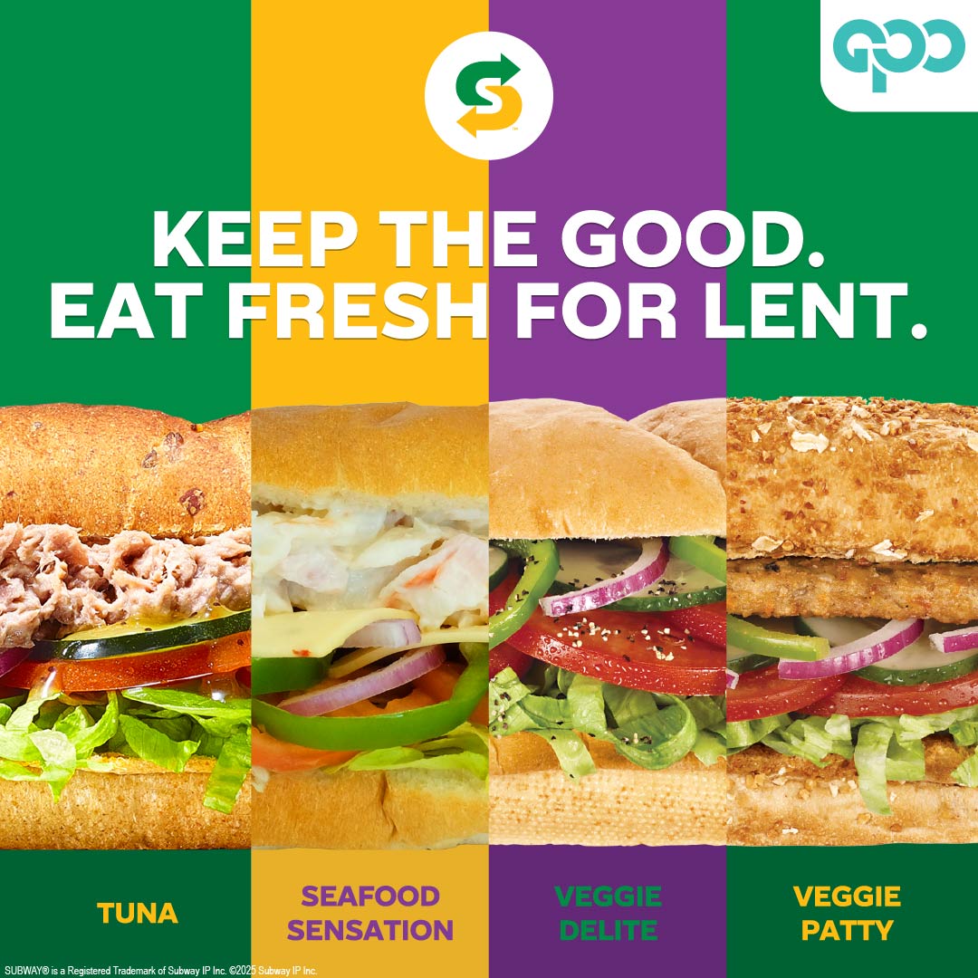 This Lenten Season, keep the good and eat fresh at Subway GPO. With a delicious Lent-friendly menu, you’ll always have fresh, flavorful choices to savor: Tuna, Veggie Delite, Seafood Sensation, Veggie Patty.